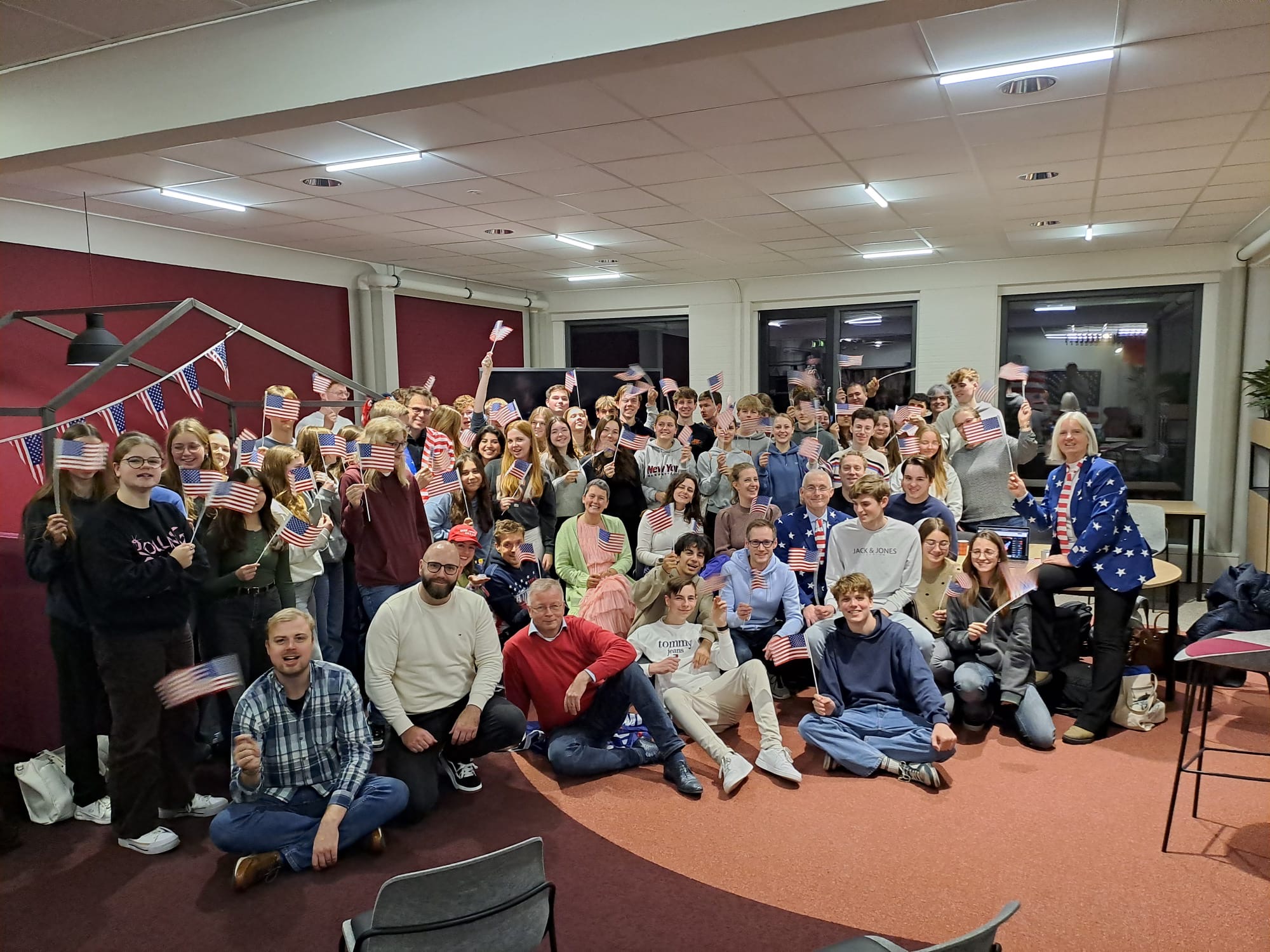 Wordt het Harris of Trump? Vannacht om 03.00 uur verzamelden leerlingen en docenten zich op school om de uitslag van de Amerikaanse verkiezingen te volgen. Er werden diverse workshops georganiseerd en leerlingen gaven continu updates over de voortgang van de uitslag in de verschillende staten. Uiteraard kon er ook gestemd worden, waarbij 90% van de stemmen naar Harris ging!