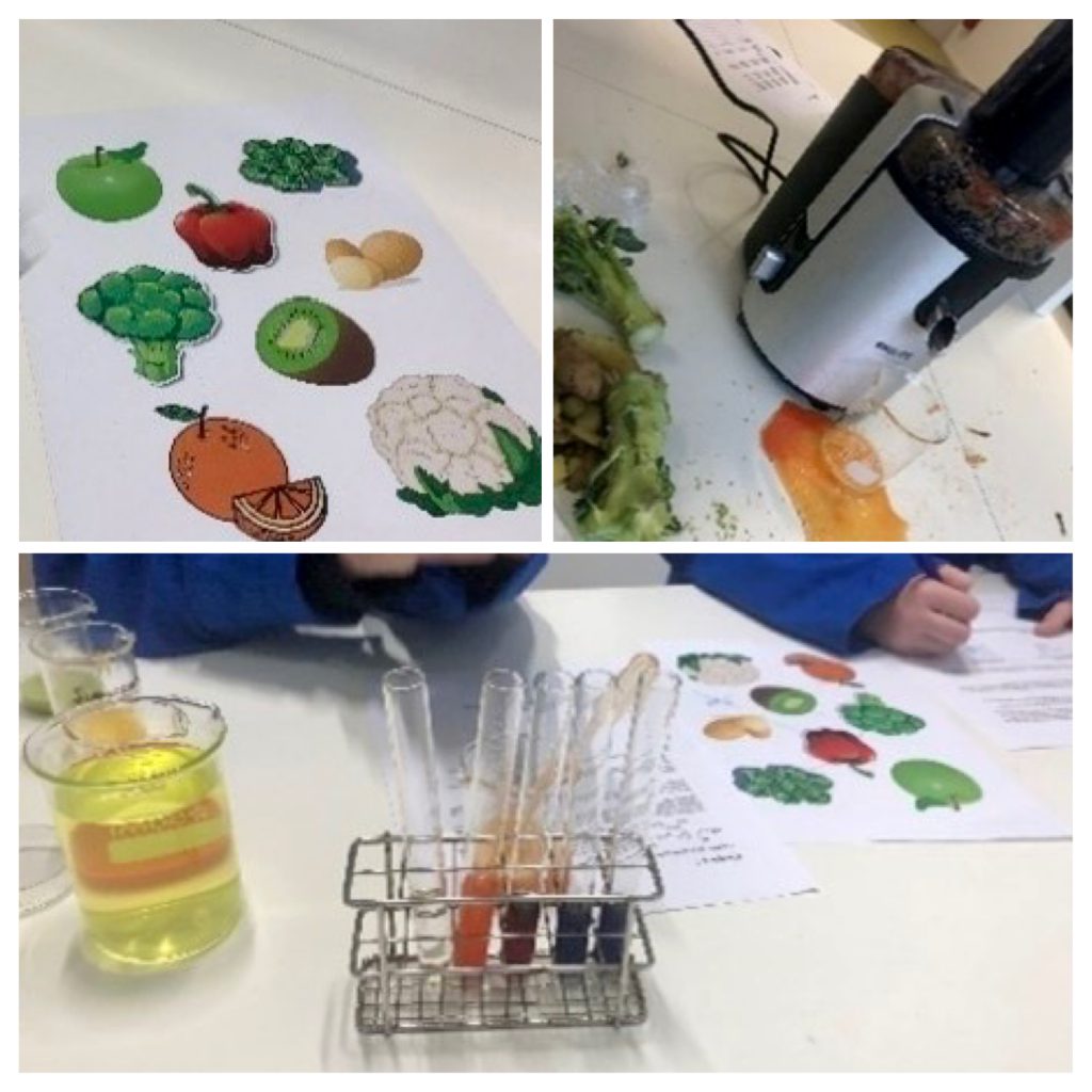 Nieuwsgierig begonnen de leerlingen met de 2de proef waarbij ze allemaal een labjas aan mochten trekken. Hilarisch! Als echte onderzoekers gingen de leerlingen aan de slag in het laboratorium om te kijken in welke groente of fruit de meeste vitamine C zit. Broccoli, spruitjes, rode paprika’s, kiwi’s en aardappels werden in de centrifuges tot sap geperst. Het geperste sap werd toegevoegd aan een reageerbuisje met blauwe vloeistof. Deze blauwe vloeistof ontkleurt door vitamine C. Zo ontstonden er vele kleurrijke reacties in het lab van Winkler Prins. De leerlingen waren zichtbaar onder de indruk van hun eigen verborgen talent. Topmiddag!