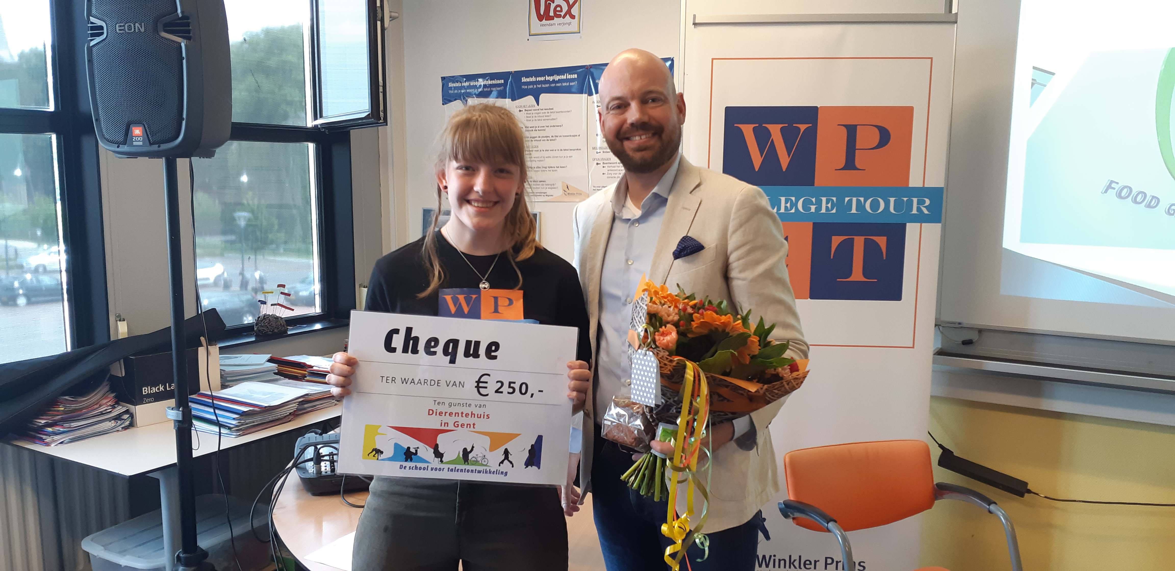 Op vrijdag 24 mei was in het kader van de Winkler Prins College Tour Derk Oorburg bij ons te gast. Hij is opgeleid als dierenarts en manager kwaliteitszorg bij één van de grootste vleesverwerkende bedrijven in ons land (VION). Dagelijks is hij medeverantwoordelijk voor wat er bij 100 miljoen mensen (!) op het bord komt. Derk werd onder vuur genomen door leerlingen van vwo 4 en vwo 5 met het vak biologie in hun profiel. Onderwerpen waren dierenwelzijn, vegetarisme, diergeneeskunde en het klimaat. Zijn tip voor alle aanwezigen: “Als je twijfelt of je iets wel of niet moet doen, doe het dan maar. Het pakt meestal goed uit”. Als dank voor zijn bijdrage kreeg Derk een mooi bedrag voor het goede doel van zijn keuze.